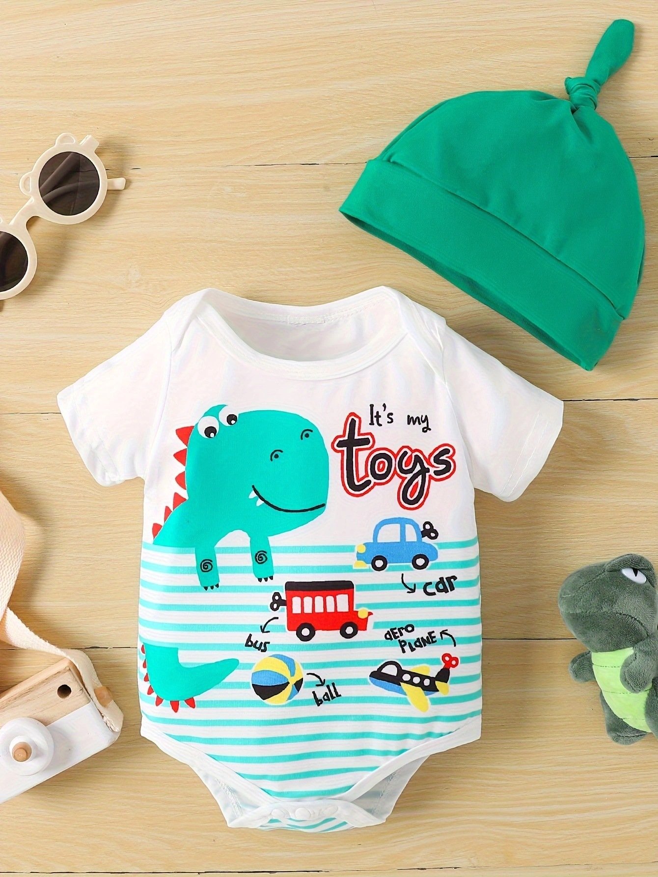 The romper features a fun cartoon dinosaur print with colorful toy graphics, adding a playful touch your baby will love. Designed with easy snap buttons at the bottom for quick diaper changes. The set comes complete with a matching cap, making it a perfect coordinated look for outings, playtime, or gifting.