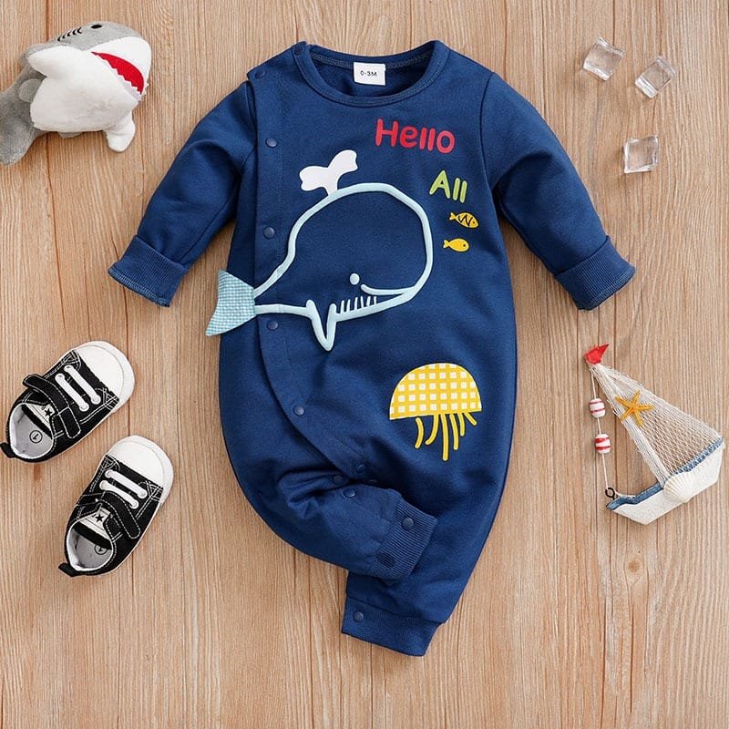 It features long sleeves, a footed design, and a secure snap-button closure—providing full-body coverage and making diaper changes quick and easy. Ideal for chilly days indoors or fun outdoor moments, this romper combines comfort and practicality.