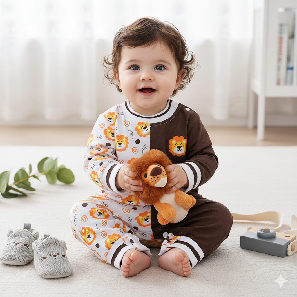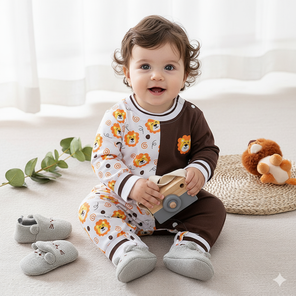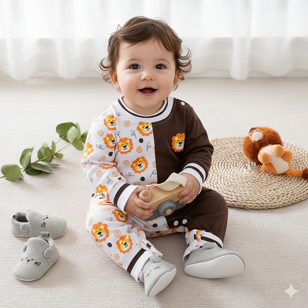 It features long sleeves, a footed design, and a secure snap-button closure—providing full-body coverage and making diaper changes quick and easy. Ideal for chilly days indoors or fun outdoor moments, this romper combines comfort and practicality.