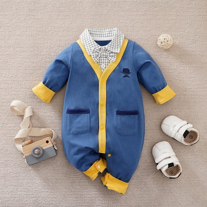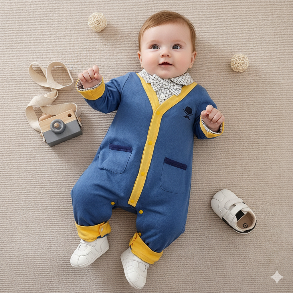 It features long sleeves, a footed design, and a secure snap-button closure—providing full-body coverage and making diaper changes quick and easy. Ideal for chilly days indoors or fun outdoor moments, this romper combines comfort and practicality.
