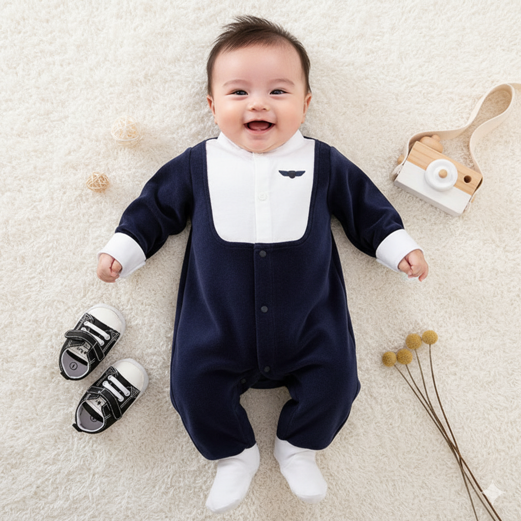 It features long sleeves, a footed design, and a secure snap-button closure—providing full-body coverage and making diaper changes quick and easy. Ideal for chilly days indoors or fun outdoor moments, this romper combines comfort and practicality.